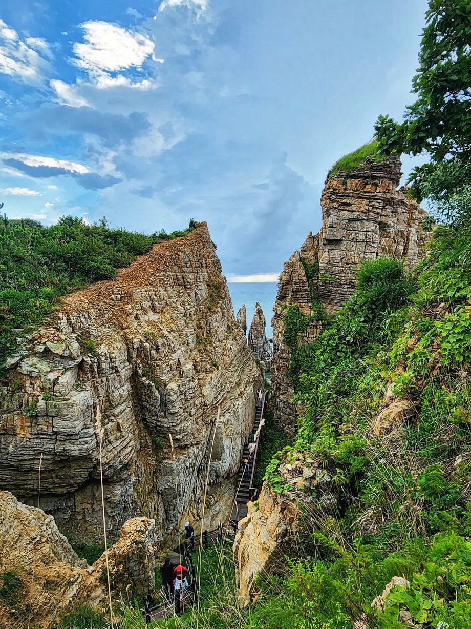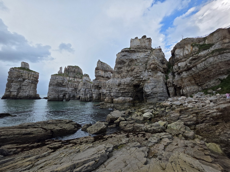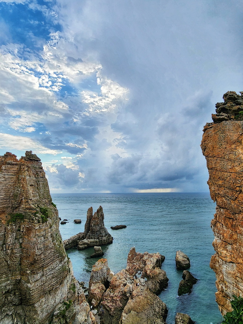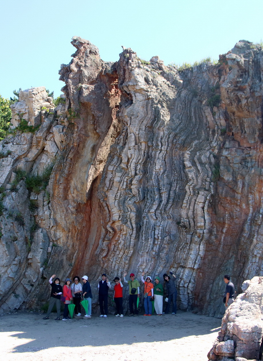 인천여객터미널에서 뱃길 228킬로를 달려 백령도에 도착했다. 쾌속정이 없던 예전에는 10시간 이상이 걸렸다는데, 현대를 사는 우리는 4시간도 길게 느껴졌다. 가자마자 점심을 먹고 여객선으로 서북쪽 두무진을 한 바퀴 돌았다. 서해의 해금강이라 불리는 두무진 해안 형제 바위, 장군바위, 코끼리바위 기묘한 암석들이 장관이다. 10억 년 전 모래가 열과 압력으로 퇴적암인 사암이 되었다가, 더 깊은 지하에서 고온 고압에 의하여 변성암인 규암으로 변한 이 암석은, 외부의 침임을 막는 중요한 방어지점에 있어 천연 요새 역할을 한다. 장군들이 머리를 맞대고 회의를 하는 것 같다 하여 붙여진 이름 두무진頭武津, 이름처럼 위풍당당하게 바다를 향해 늘어선 기암절벽은 신의 작품인 듯 경이로웠다.